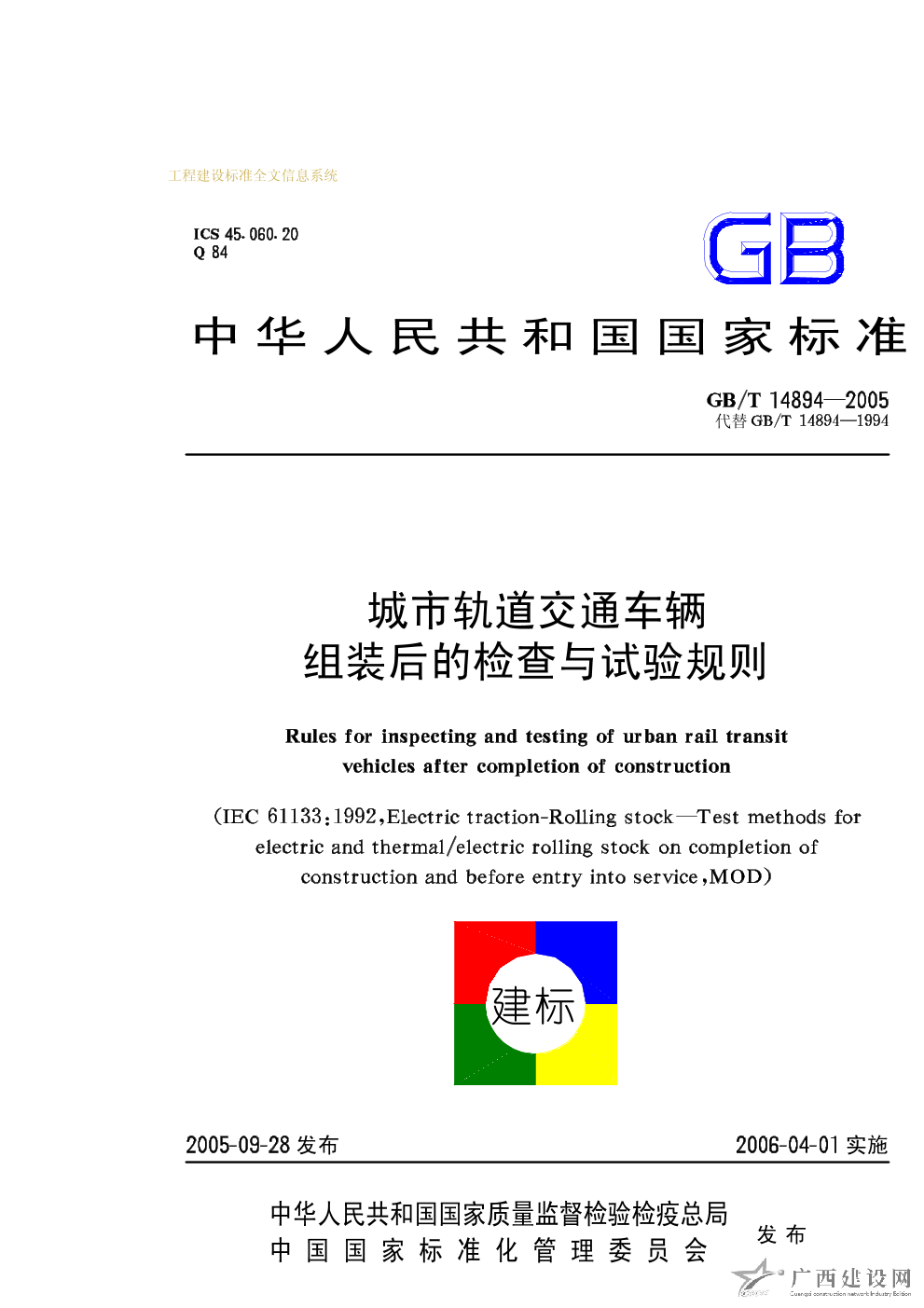 城市軌道交通車輛組裝后的檢查與試驗規則 GB/T14894-2005