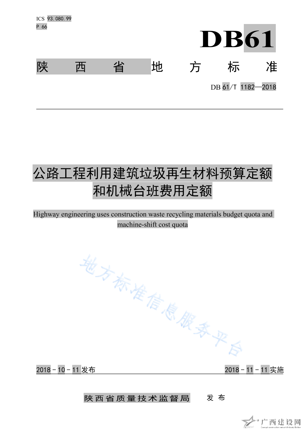 DB61 T1182-2018公路工程利用建筑垃圾再生材料預(yù)算定額和機(jī)械臺(tái)班費(fèi)用定額