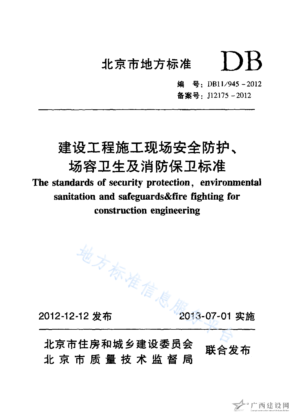 DB11 945-2012_建設(shè)工程施工現(xiàn)場安全防護(hù)、場容衛(wèi)生及消防保衛(wèi)標(biāo)準(zhǔn)