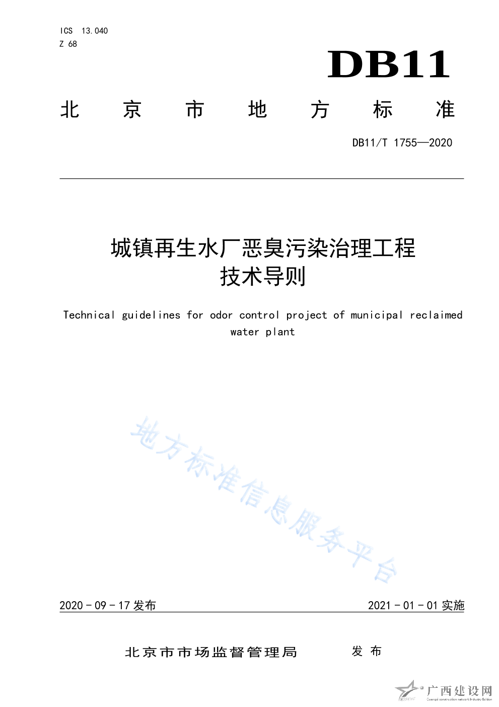 DB11 T+1755-2020城鎮(zhèn)再生水廠惡臭污染治理工程技術(shù)導(dǎo)則