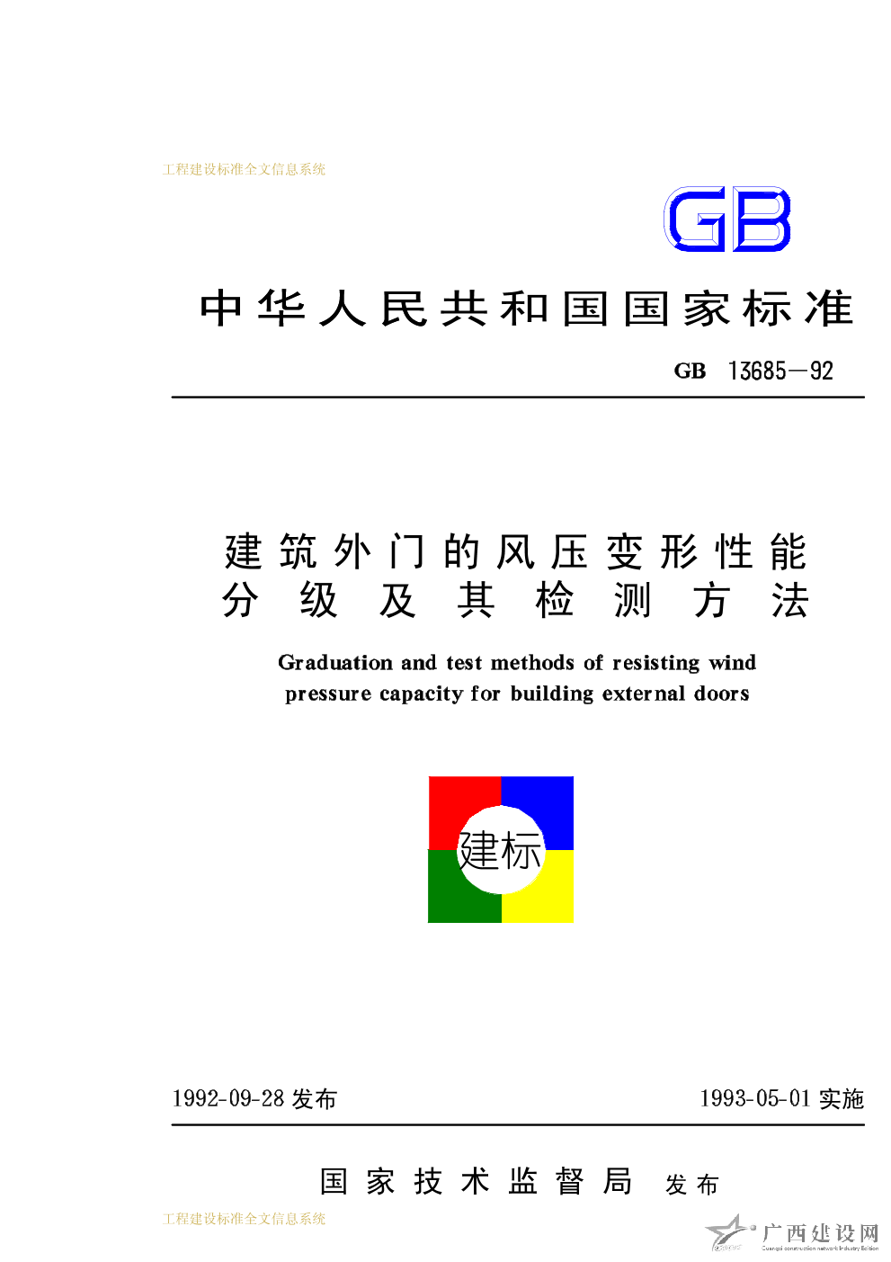 建筑外門的空氣滲透性能和雨水滲漏性能分級及其檢測方法 GB13686-92