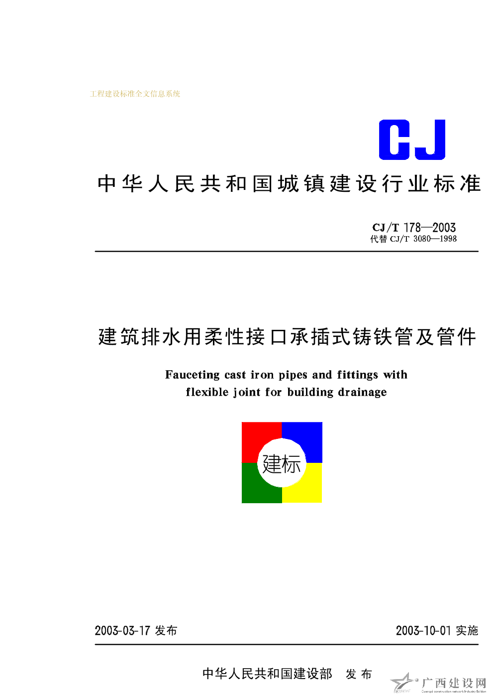 建筑排水用柔性接口承插式鑄鐵管及管件 CJ/T178-2003