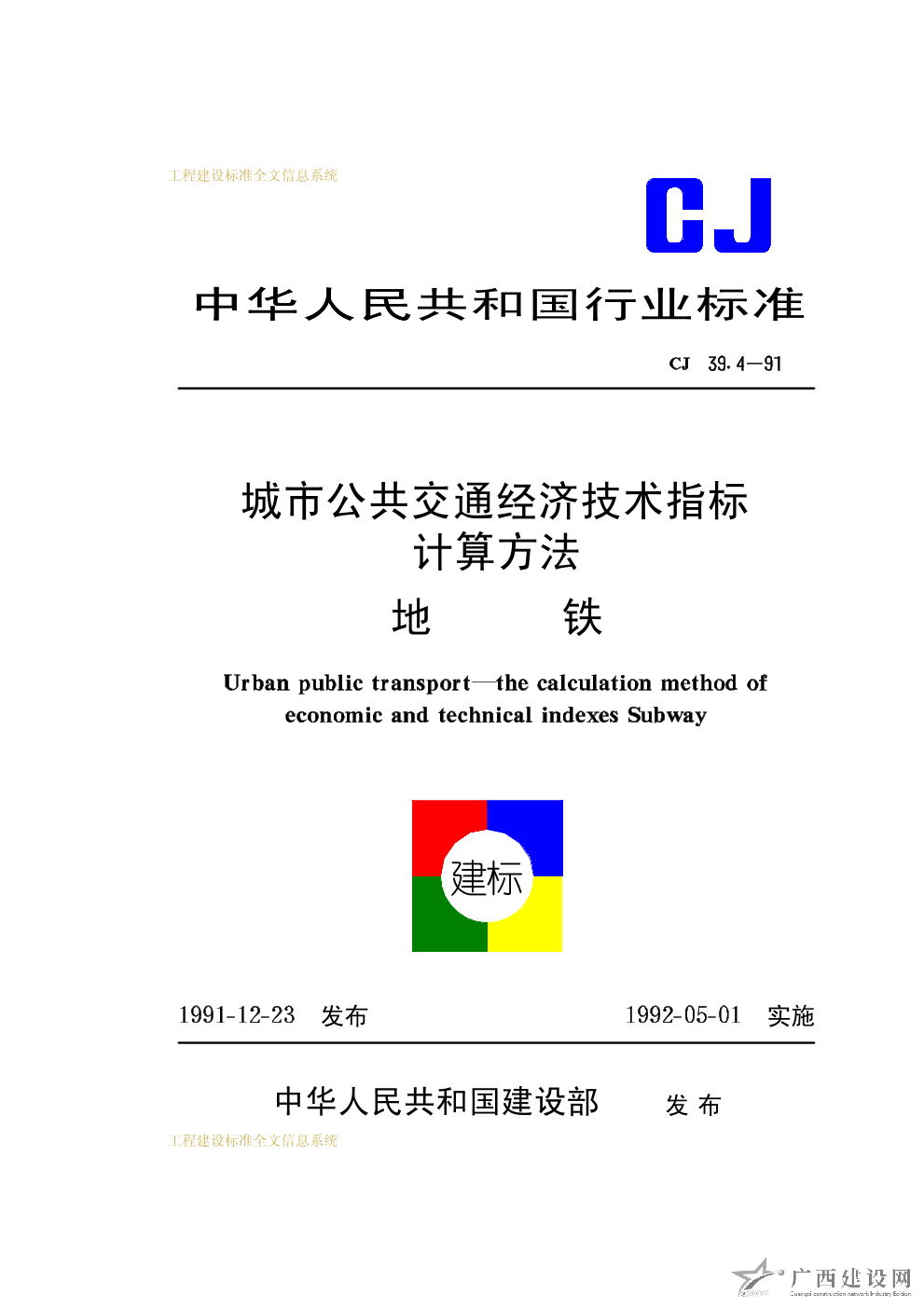 城市公共交通經(jīng)濟(jì)技術(shù)指標(biāo)計算方法地鐵 CJ39.4-91
