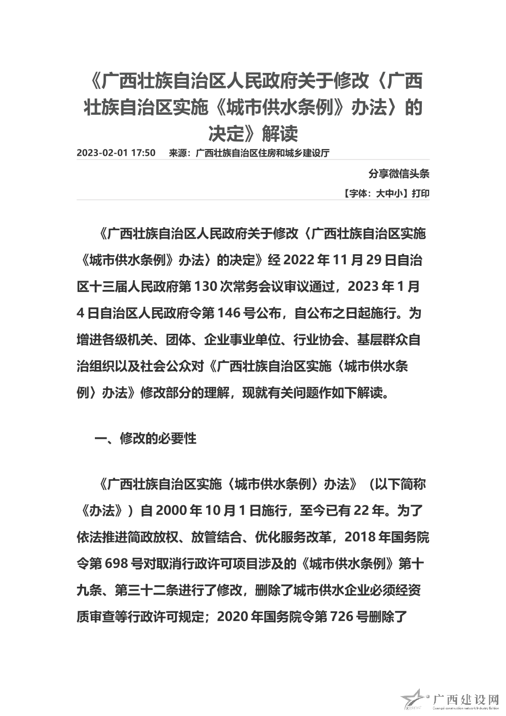 《廣西壯族自治區人民政府關于修改〈廣西壯族自治區實施《城市供水條例》辦法〉的決定》解讀