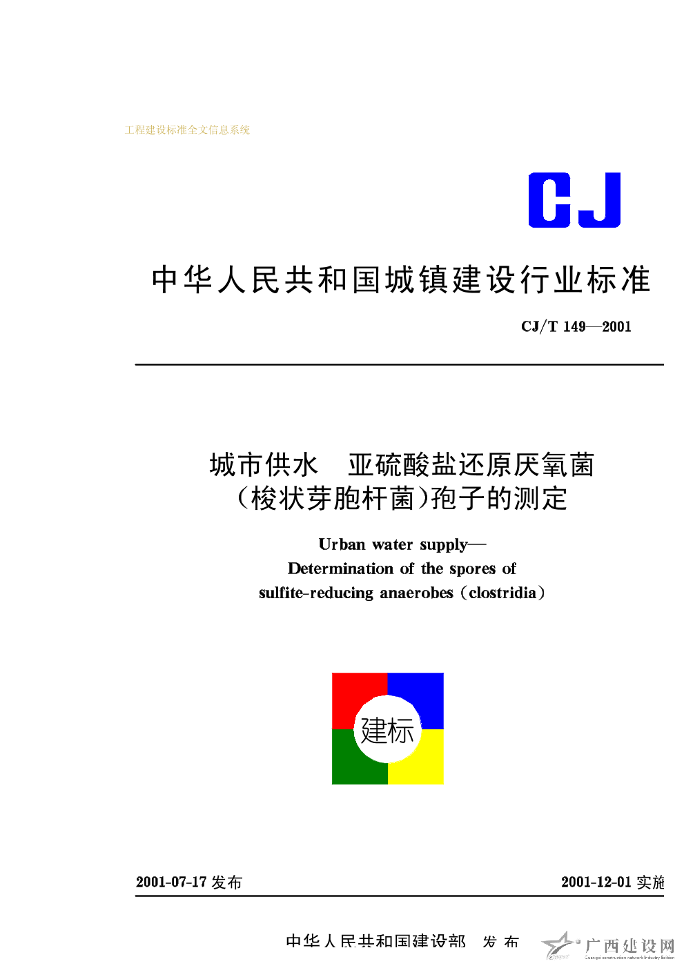 城市供水 亞硫酸鹽還原厭氧菌(梭狀芽胞桿菌)孢子的測定 CJ/T149—2001