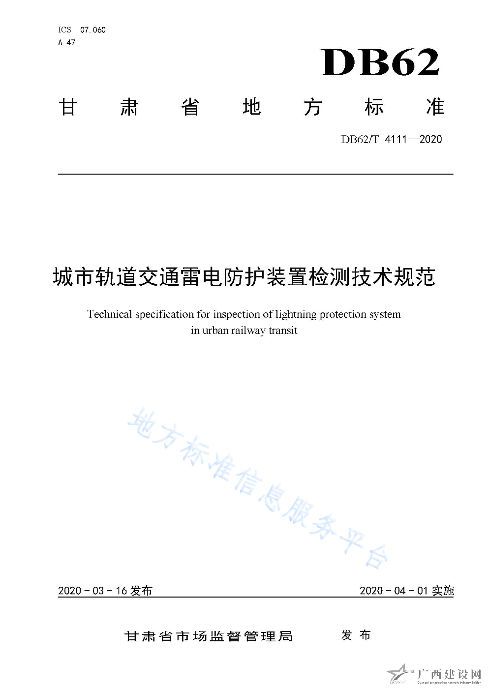 DB62 T4111-2020城市軌道交通雷電防護(hù)裝置檢測技術(shù)規(guī)范