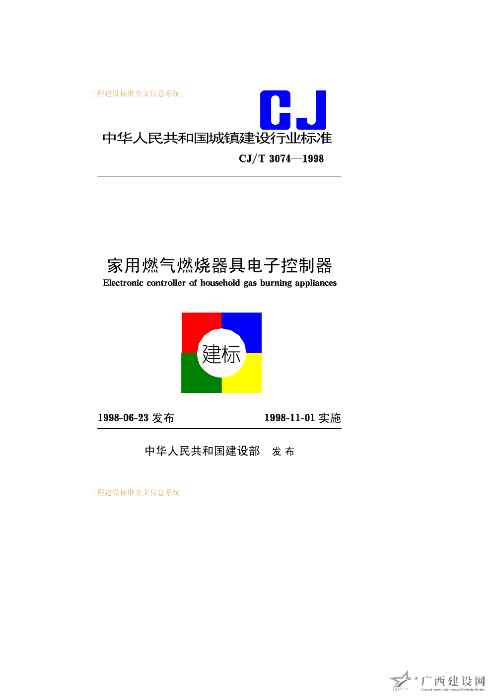 家用燃?xì)馊紵骶唠娮涌刂破? CJ/T3074—1998