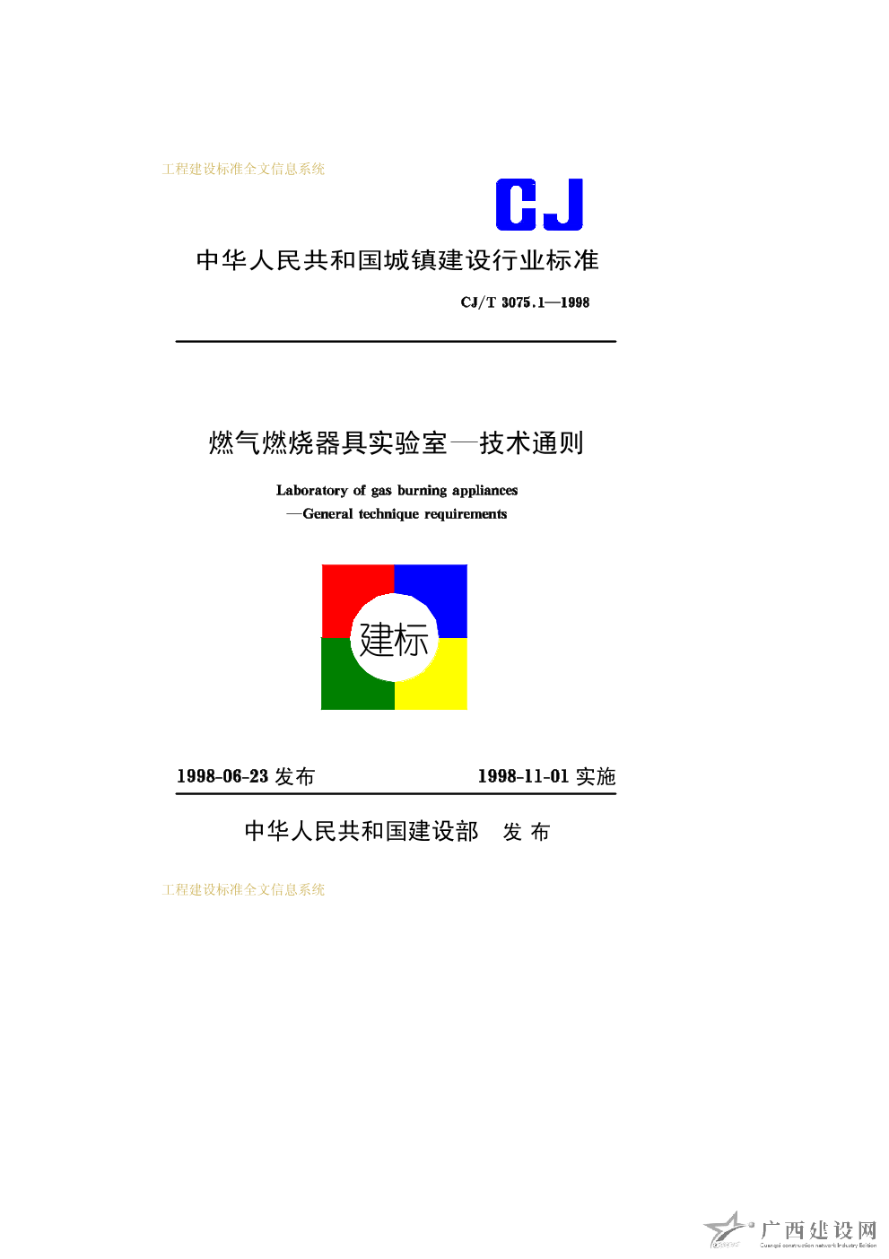 燃?xì)馊紵骶邔?shí)驗(yàn)室—技術(shù)通則 CJ/T3075.1—1998