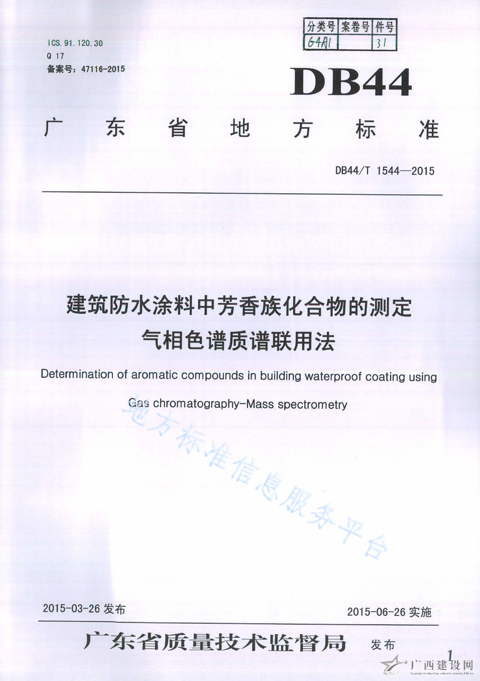DB44 T 1544-2015建筑防水涂料中芳香族化合物的測定 氣相色譜質(zhì)譜聯(lián)用法