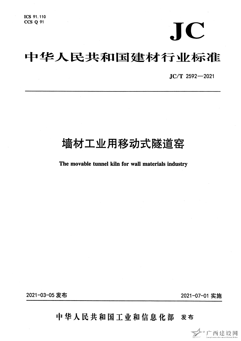 JC T 2592-2021 墻材工業(yè)用移動式隧道窯